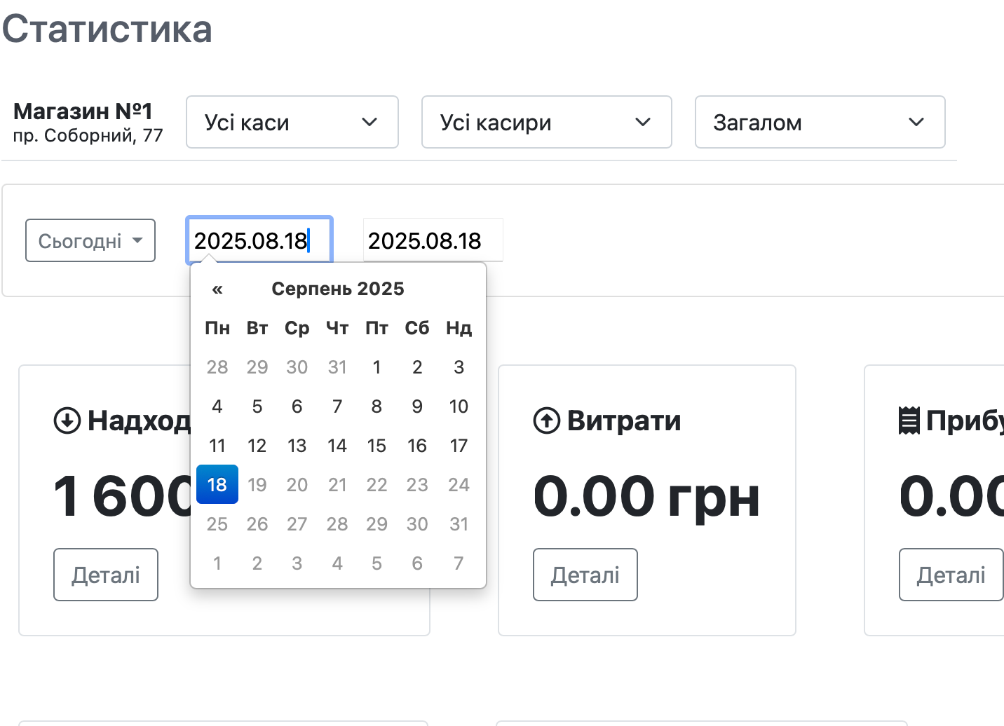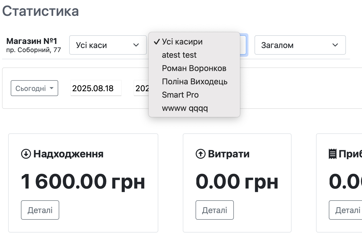 Тепер ефективність менеджерів можна досліджувати ще більш детально. Функція доступна менеджерам з рівнем доступу до системи "Суперадміністратор"'. На головній сторінці "Початок" додано фільтр "Усі касири", у якому можна обрати конкретного менеджера і детально проаналізувати його надходження, продажі, прибутки, середній чек та інші необхідні показники. При цьому також залишається можливість переглядати всі ці дані за обраний Вами період.