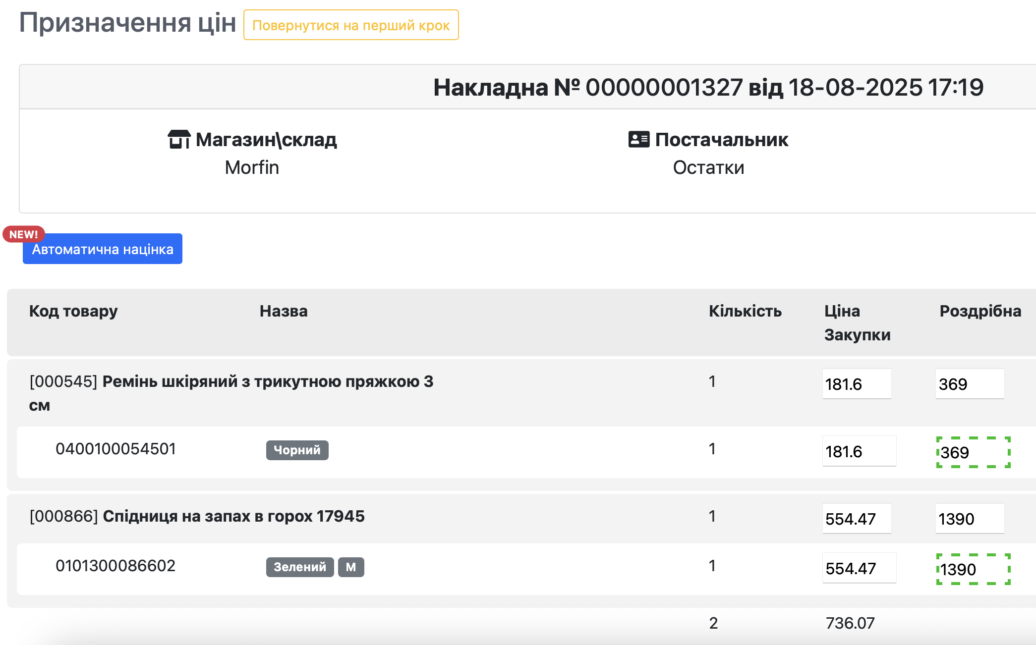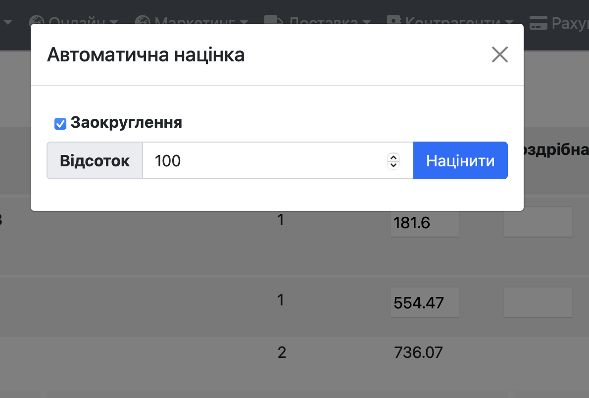 На другому етапі приходу товару на склад натисніть кнопку "Автоматична націнка", оберіть відсоток націнки, додайте заокруглення — і система сама розрахує роздрібні ціни за заданим алгоритмом. Жодних копійок і зайвих рухів. Усе автоматично! Ця функція заповнить усі поля роздрібними цінами, які за необхідності можна підкоригувати.