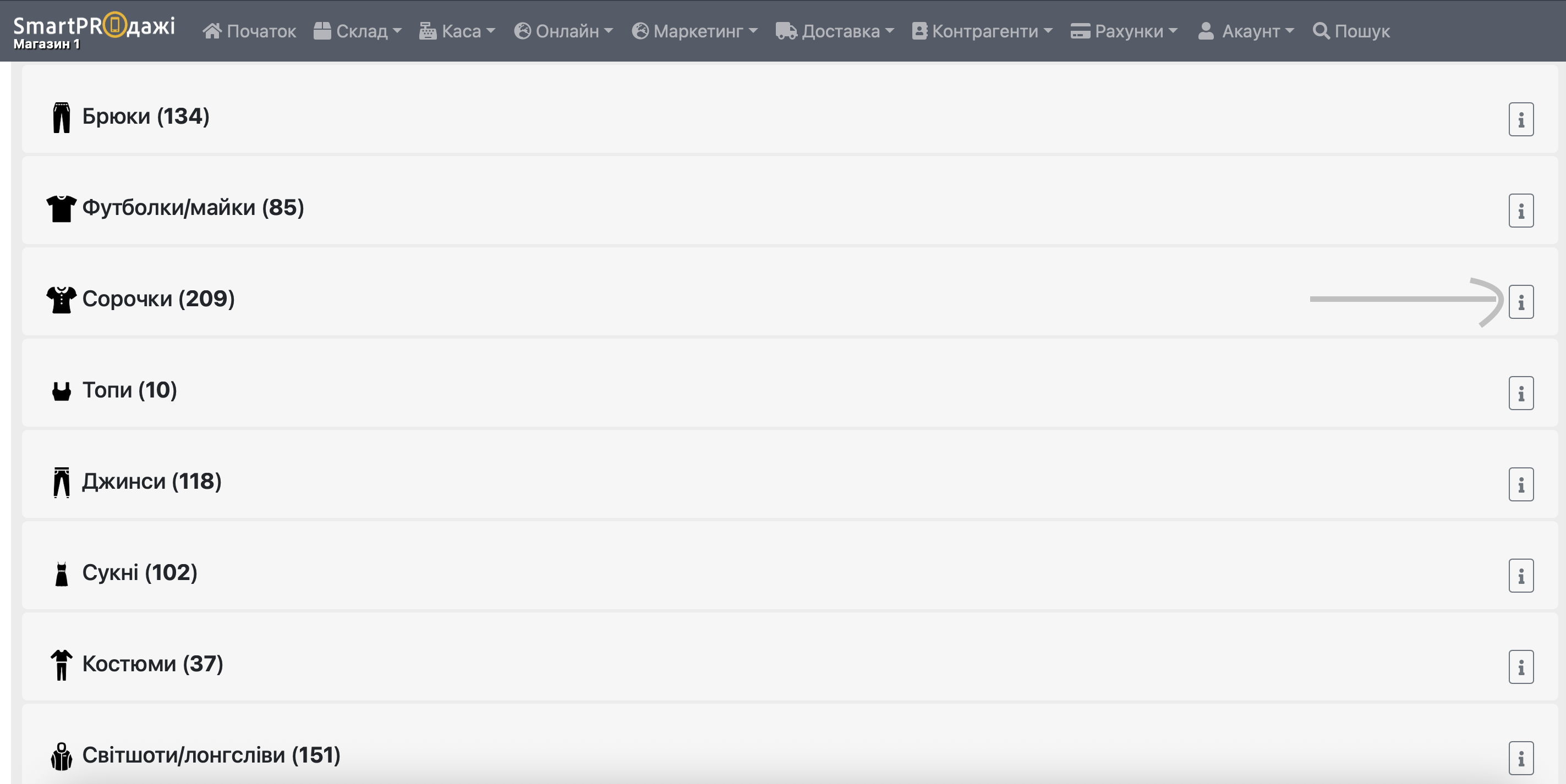 У SmartPROдажі суперадміни можуть миттєво бачити кількість товарів на складі, суму закупки та прогнозовану вартість продажу - як по всьому складу, так і по кожній категорії чи навіть підкатегорії. Натисніть кнопку "Інформація" - і отримаєте точні дані для ефективного управління товаром.