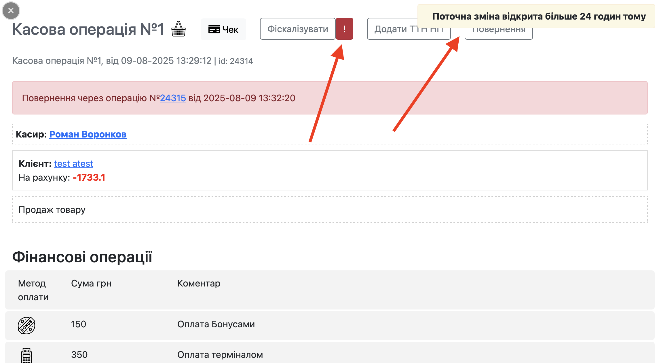 Якщо під час фіскалізації продажу виникла помилка - система відобразить це у касовій операції іконкою чека червоного кольору. Щоб побачити причину відмови - зайдіть в необхідну касову операцію, натиснувши на її порядковий номер, і натисніть на кнопку з червоним знаком оклику. Система покаже помилку, після виправлення якої скористайтесь кнопкою "Фіскалізація" у касовій операції.