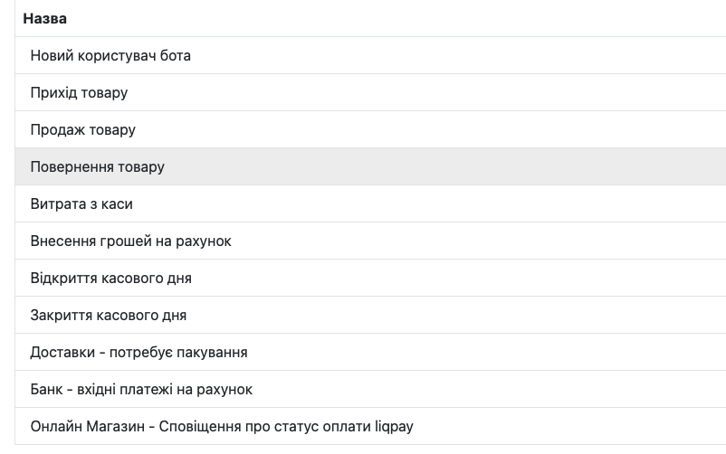 Додали нове системне сповіщення в Telegram — про повернення товару. Увімкнути можна в Контрагенти/Співробітники → Сповіщення: поставте чекбокс навпроти «Повернення товару». Відтепер отримуватимете не лише повідомлення про продажі, а й про всі повернення в системі.